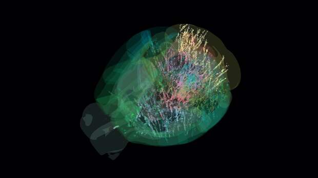 В последние десятилетия становилось все более очевидно, что изолированное изучение регионов не дает полной картины. Главная проблема заключалась в том, что разные лаборатории изучали разные участки мозга, используя разные поведенческие задачи и методы анализа. Интегрировать такие разрозненные данные в единую модель было невозможно: мозг, даже мышиный, просто слишком большой для этого, а эксперименты слишком разные, каждый «подсвечивает» лишь крошечную часть большой «нейрональной поляны». Чтобы понять, как мозг интегрирует сенсорную информацию, прошлый опыт и ожидания для выбора действия, требовался принципиально иной подход. Были необходимы стандартизированный эксперимент и одновременный анализ активности сотен тысяч нейронов по всему мозгу. Для решения этой задачи создали международную коллаборацию International Brain Laboratory (IBL), которая объединила 22 лаборатории из Европы и США. Ученые разработали единый, строго стандартизированный эксперимент. В нем 139 мышей обучали выполнять простую на вид задачу. Животное сидело перед экраном и поворачивало небольшое рулевое колесо, чтобы переместить появившийся слева или справа полосатый круг к центру экрана. За правильное и быстрое действие мышь получала каплю сладкой воды. Ключевой особенностью задачи была ее вероятностная структура. В течение блоков из 20-100 попыток круг появлялся с вероятностью 80% с одной стороны и 20% с другой. Затем вероятности менялись на противоположные безо всякого сигнала для животного. Чтобы максимизировать вознаграждение, особенно в попытках с нулевой контрастностью (когда стимул был невидим), мышам приходилось отслеживать эту скрытую закономерность и формировать внутреннее ожидание, или «предварительную вероятность» (prior). Это позволило ученым исследовать, как ожидания влияют на будущие решения. Пока мыши выполняли задание, исследователи регистрировали нейронную активность с помощью сотен высокоплотных электродов Neuropixels. Результаты опубликованы в журнале Nature в виде сразу двух научных работ. Совместные усилия позволили собрать масштабный набор данных: активность 621 733 нейронов из 279 областей мозга. Анализ показал, что мыши действительно успешно использовали вероятностную структуру задачи, чтобы улучшить свои результаты, особенно на пробах без видимого стимула. Их точность на таких пробах составляла почти 59% — на деле это значительно выше случайного угадывания. Оказалось, информация о предварительной вероятности — внутреннем ожидании животного — кодировалась не в нескольких специализированных областях, а была распределена по всему мозгу — то, о чем давно говорят многие видные нейробиологи. Ее следы обнаружили примерно в 30% всех изученных регионов, охватывающих все уровни обработки информации: от ранних сенсорных зон, таких как первичная зрительная кора и таламус, до ассоциативных областей и моторных центров. Видео с визуализацией активации 75 000 нейронов в мозге мыши в момент принятия решения. Активность начинается с небольшого уровня, затем нарастает в зрительных областях в задней части мозга, после чего активность повышается по мере накопления данных, необходимых для принятия решения. Затем активируются двигательные области, когда начинается движение, и, наконец, активность нарастает во всём мозге, когда животное получает вознаграждение. 